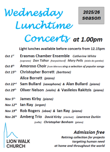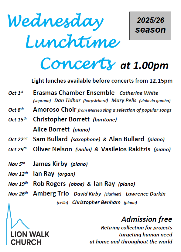 Concerts Our Lunchtime Concerts are on Wednesdays during October/November, February/March and May/June. A light lunch is available in the Church Hall from 12.15 pm Please click on the document to enlarge it.